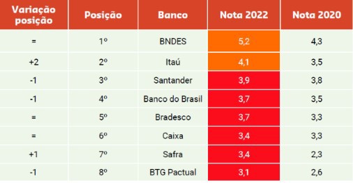E o lanterninha foi o BTG Pactual, que embora tenha evoluído bastante em relação à última avaliação – principalmente por conta do tema “Florestas”, que somou apenas 3,1 pontos. O destaque negativo foi ter tirado a pior nota em “Inclusão Financeira”.